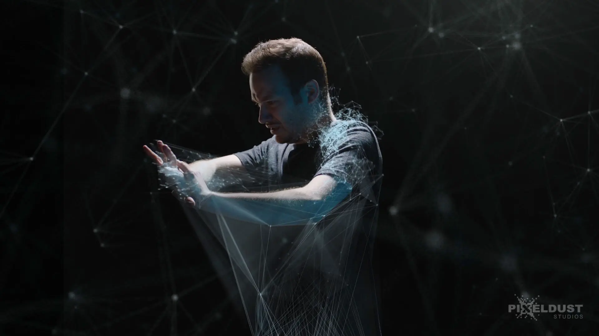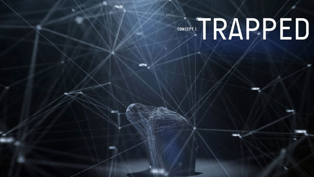Pixeldust decided to explore the theme of inescapable technology. People freely give up their personal information, and can become addicted to social media, video games, online shopping, and much more. Each website visited, email sent, and info submitted contributes to a permanent digital footprint. No matter how private it may be, this information can be used against a user and one day come back to haunt them. While the client ultimately went with this “trapped” concept, other concept explored included “projections” of the digital world, and “puppets” of technology.